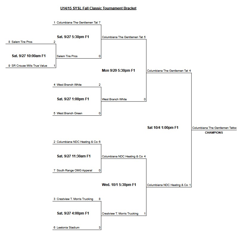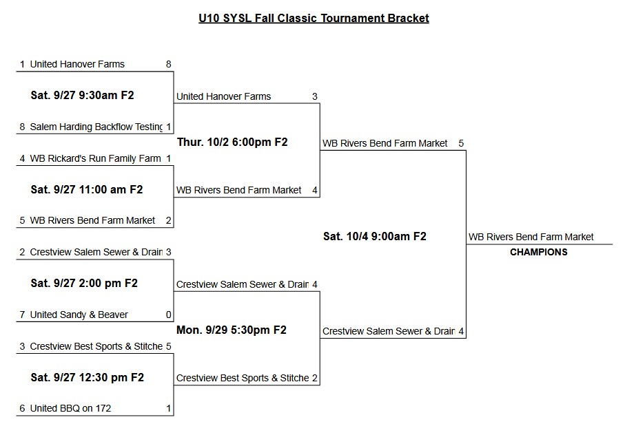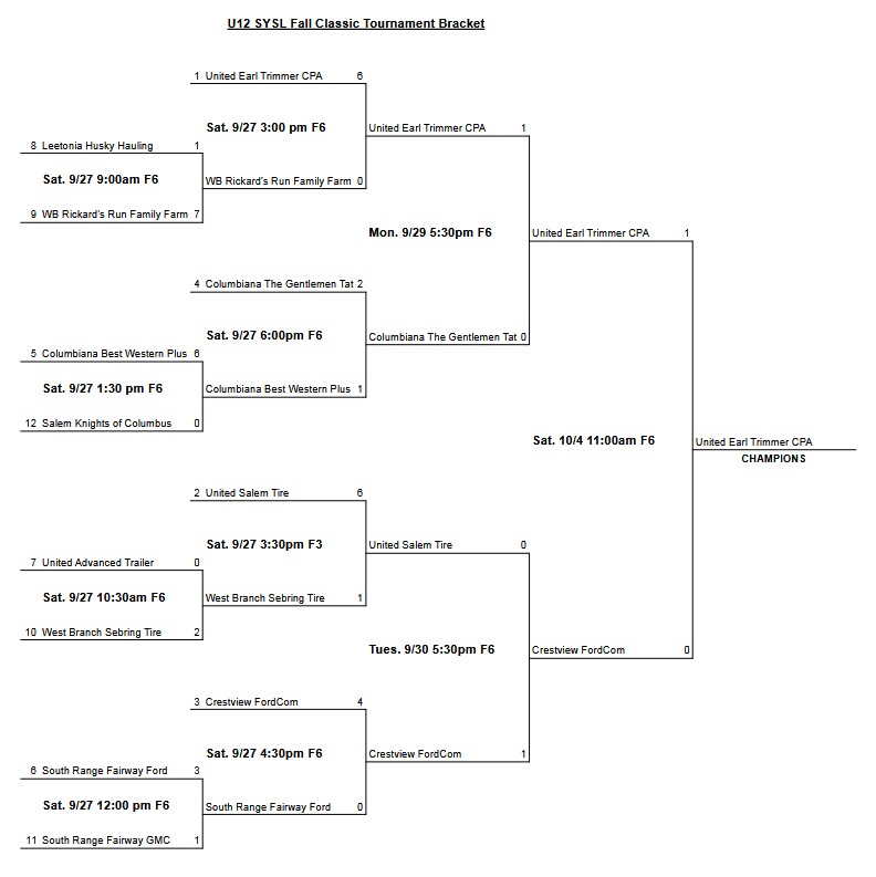 The 2025 U10, U12, and U14/15 end of season tournament will be held at Kent State Salem and begin on Saturday, Sept. 27th. All first-round games will be played this day. There are some second-round games also scheduled for Saturday, Sept. 27th. The remaining rounds will be played Mon-Thu., Sept. 29th- Oct. 2nd. Championship Saturday will be Oct. 4th.Seeding for the tournament will be based on 3 points for a win, 1 point for a tie, 0 points for a loss in regular season games. Final total point ties will move to a goal differential tie breaker (maximum 5 goal differential per game). Scores not reported by coaches will not count in the standings. Dates and times are subject to change if necessary.The winning coach is responsible to report the final score ASAP after the game. The winning coach shall submit the score via the score reporting form used during the regular season.Click for: TOURNAMENT RULES